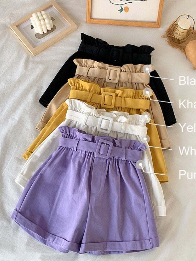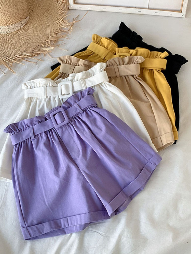Women Casual High Waist Loose Cotton Short Pants 2022 Summer Elegant Sweet Girls All-Match Wide Leg Shorts With Belt Korean
