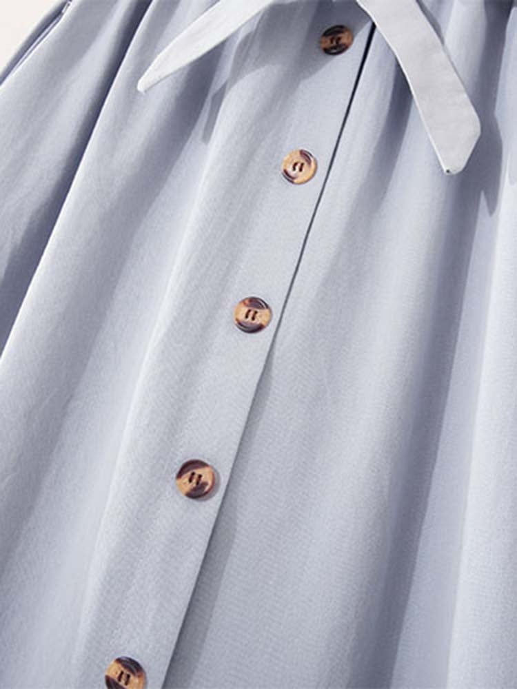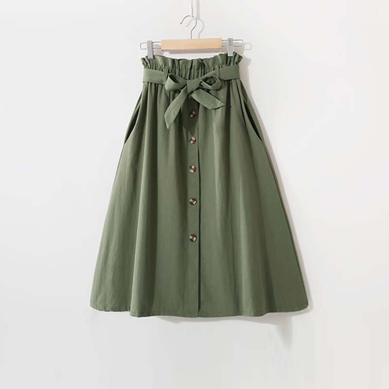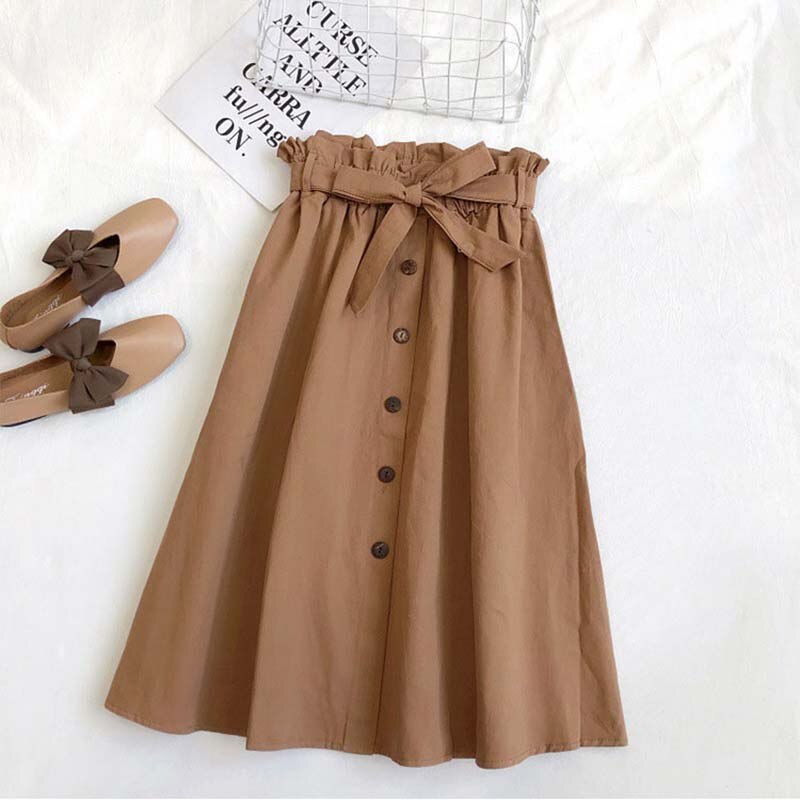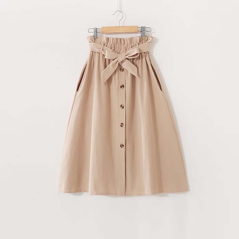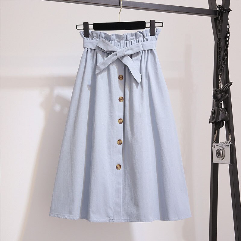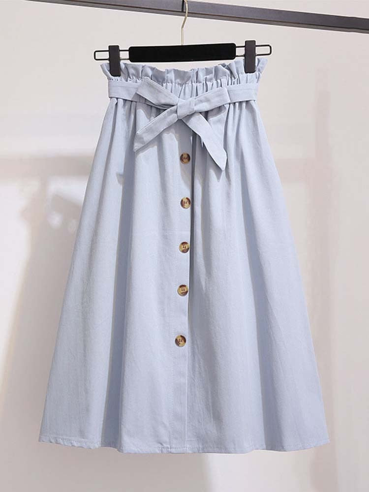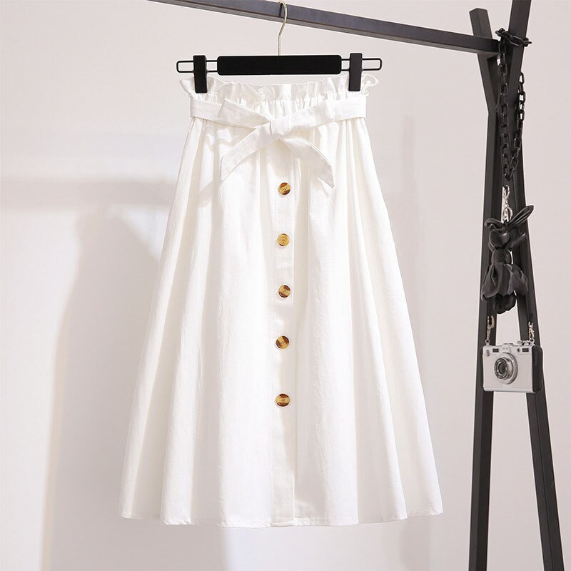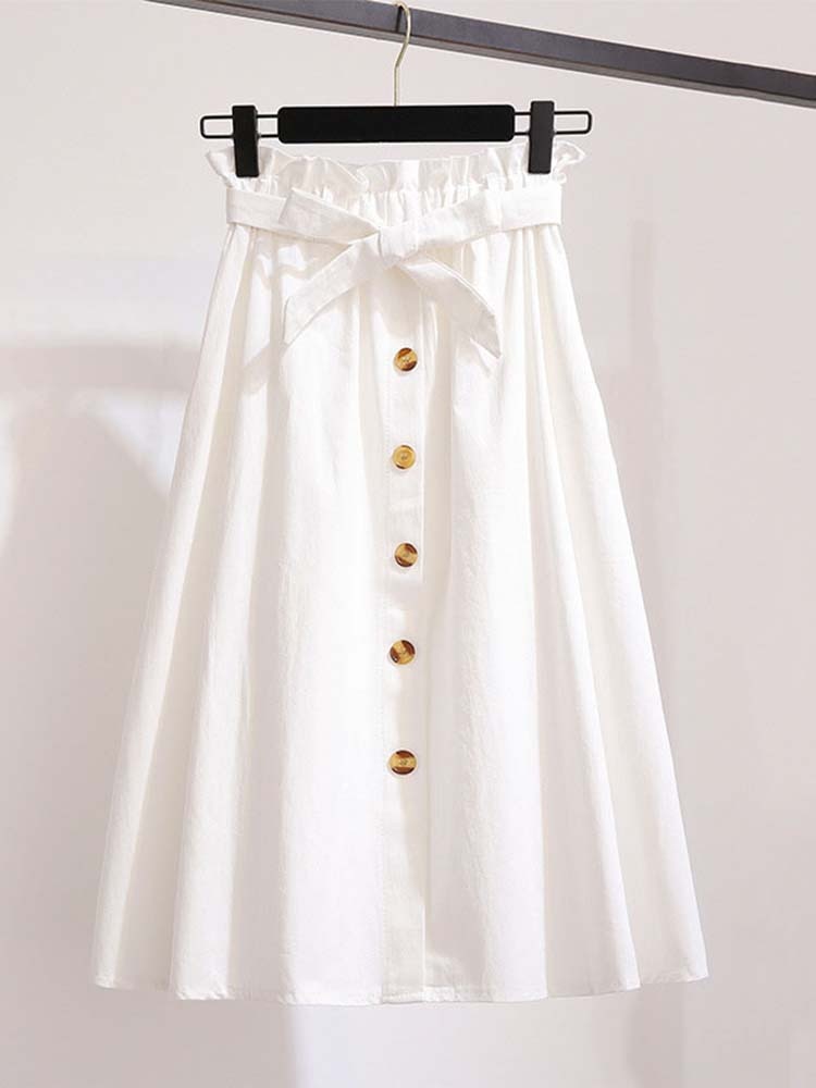 Women Elegant High Waist Midi Skirt Spring And Summer Casual Single-Breasted Solid Black White Bowknot Belt Office A-Line Skirt