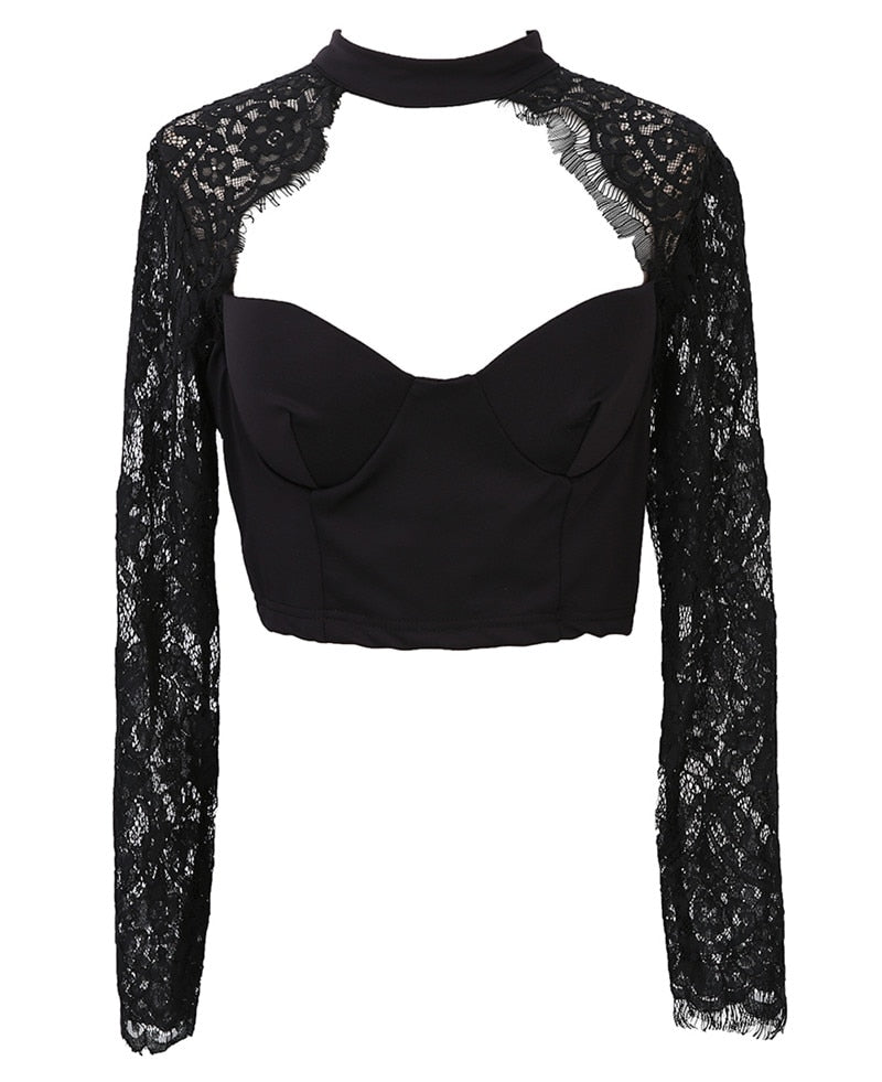 Women Sexy Lace Patchwork Tops Long Sleeve Push Up Padded Bra Sexy Crop Tops Ladies Lace T-Shirt Tops Slim Tops Fashion