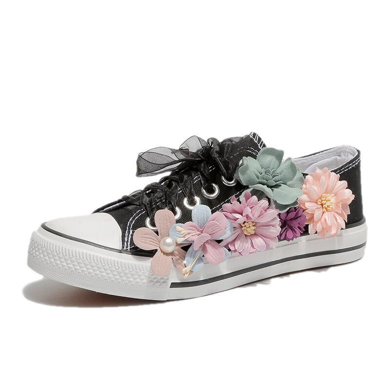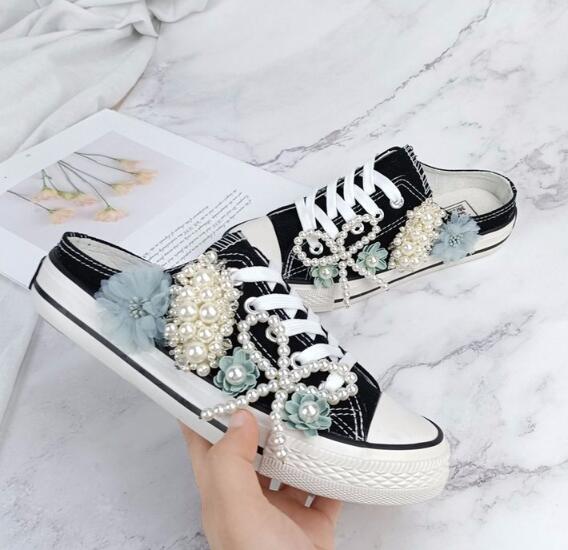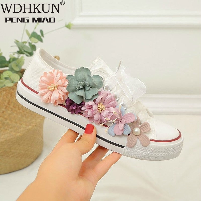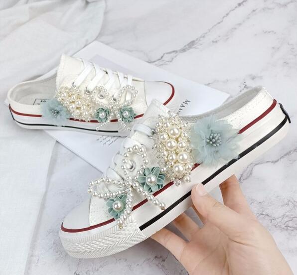 Women Sneakers Summer Canvas Shoes White Ribbon Strap Sew Colorful Flowers Pearl Diamond Ribbon Thick-soled Flat Stud E146