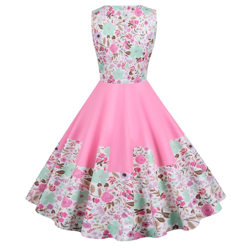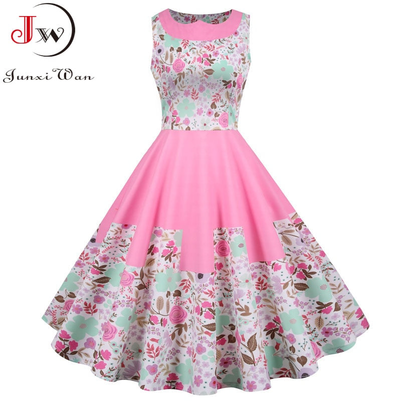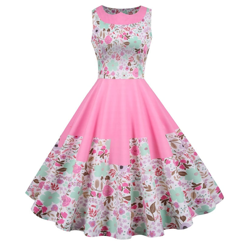 Women Summer Dress Vintage Peter Pan Collar Pink Floral Print Sleeveless Midi Tunic Casual High Waist Party Sundress