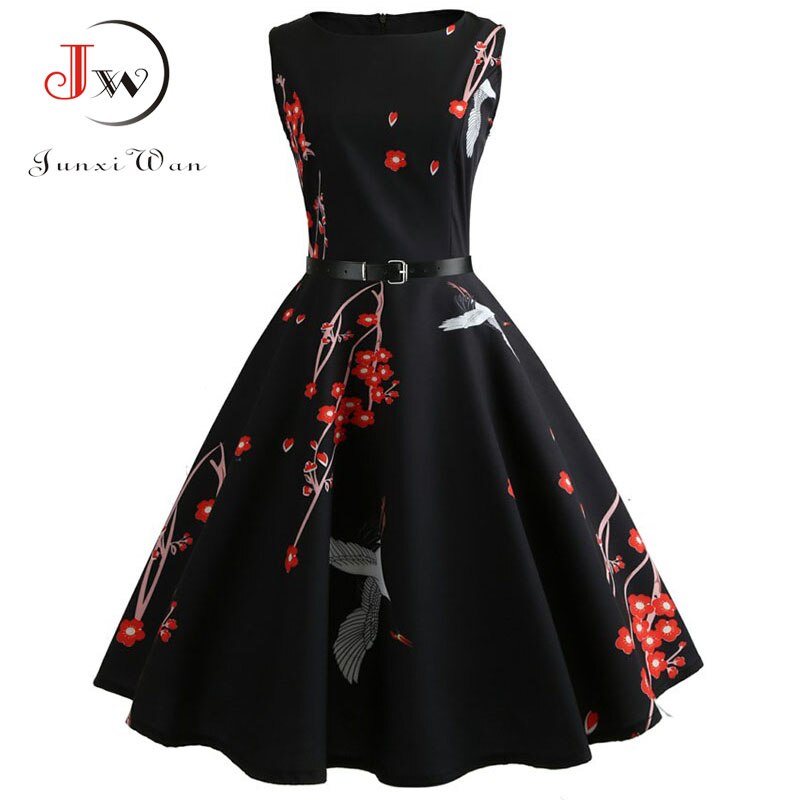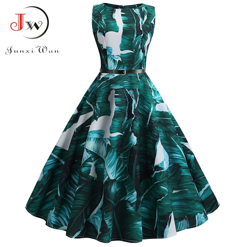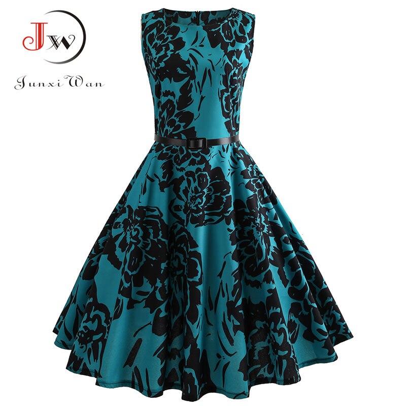 Women Vintage Floral Print Summer Dress Elegant Swing Rockabilly Party Dresses Casual Midi Tunic Beach Dress