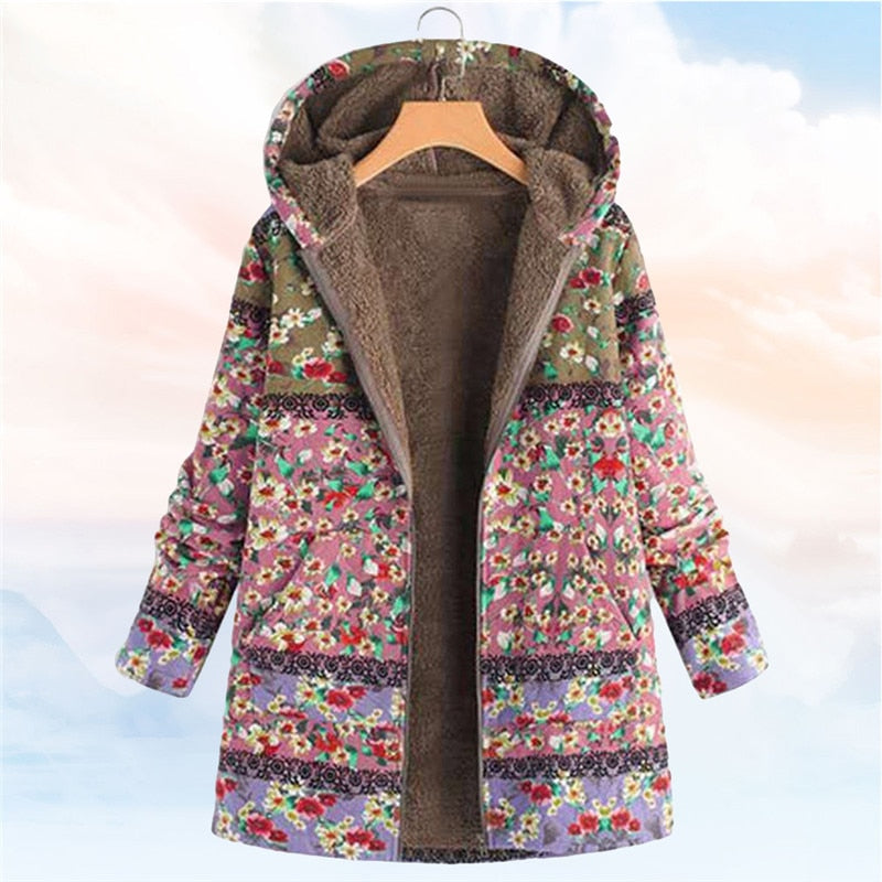 Women's Vintage Ethnic Coats Winter Printed Pockets Hooded Zipper Jackets Full Sleeve Casual Plus Size Plush Parkas Coats