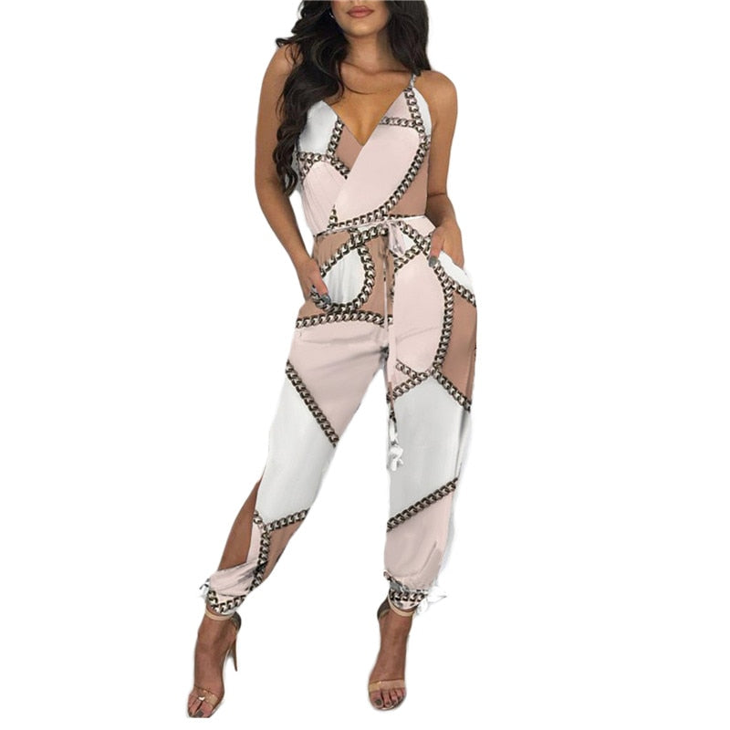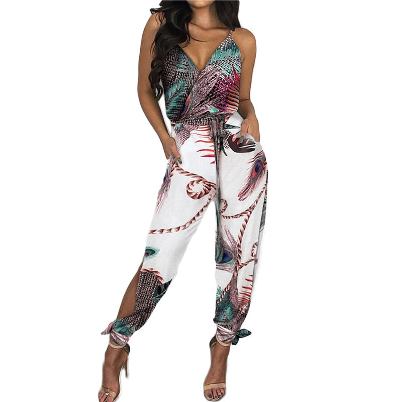 Xinging Women Jumpsuit Spaghetti Strap Mixed Print Slit Leg Jumpsuit Sexy V-Neck Jumpsuits for Women Clubwear Outfits Rompers