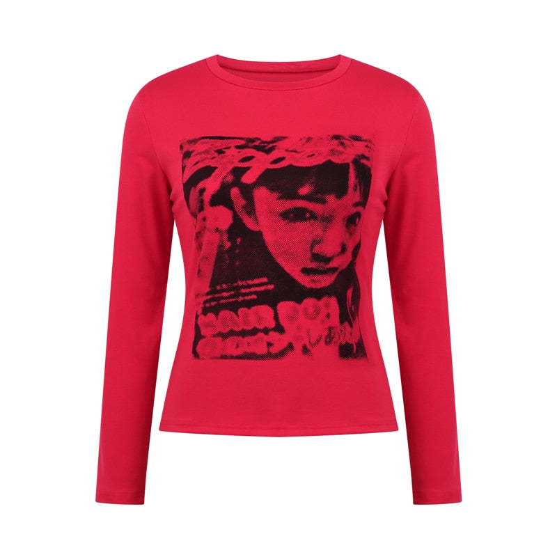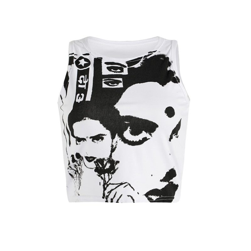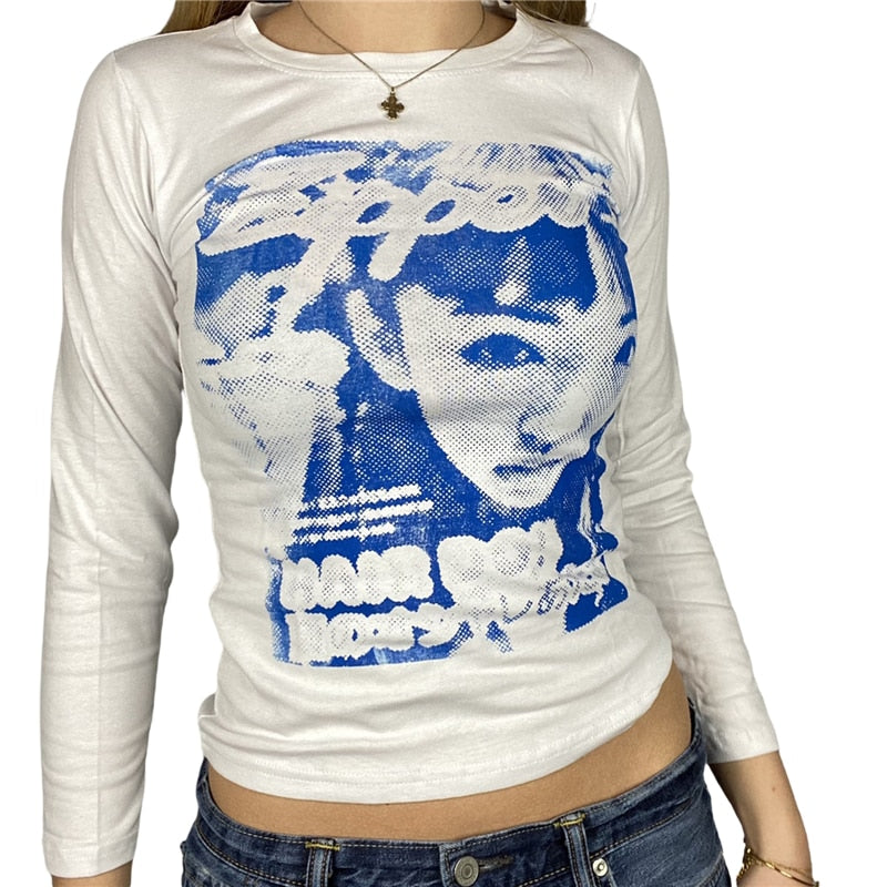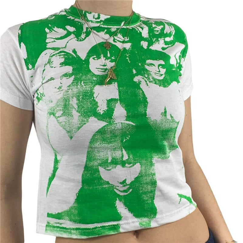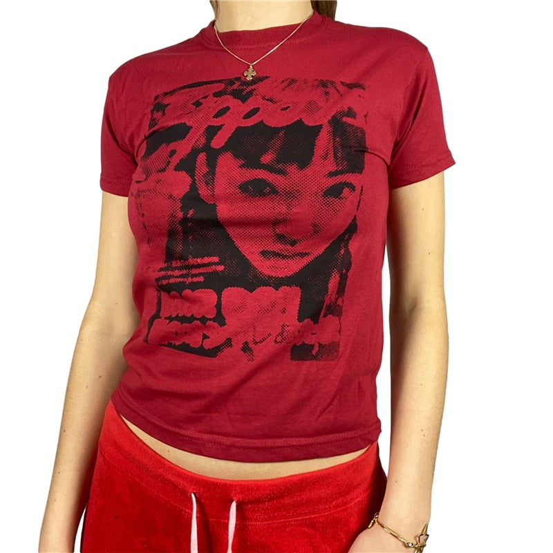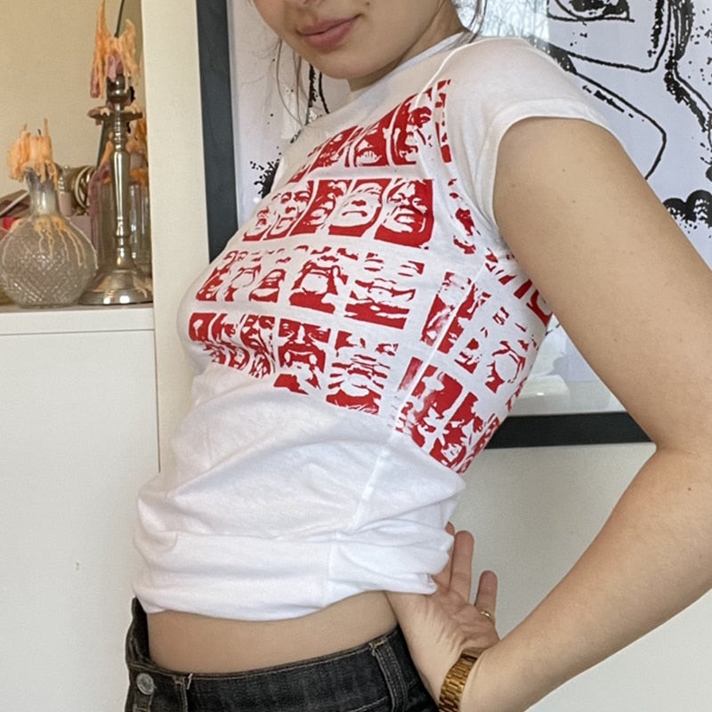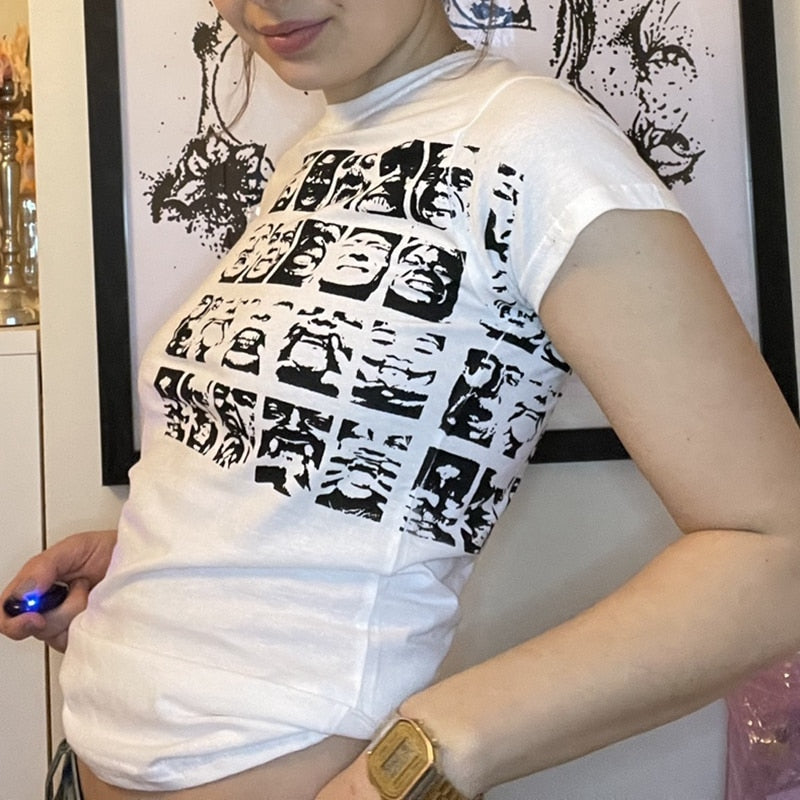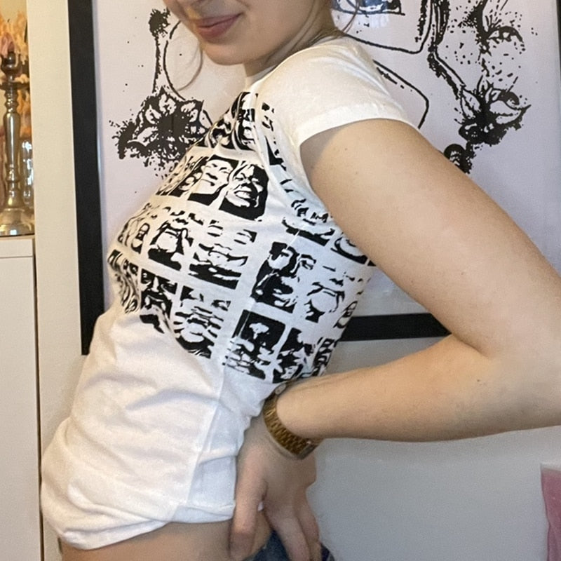Xingqing Gothic Portrait Print T-shirt Aesthetic Short Sleevle Sweats Tees Harajuku Streetwear White Crop Top Women Clothes