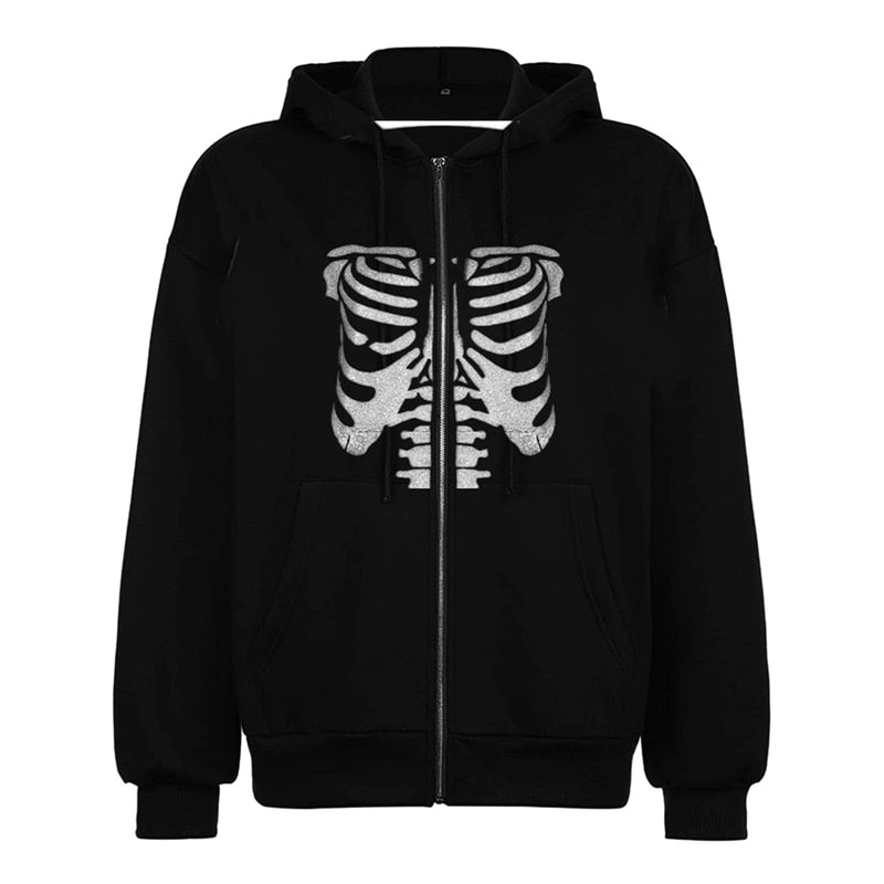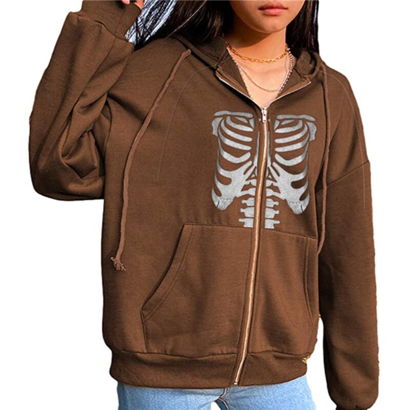 Xingqing Women Y2K Zip Up Hooded Sweatshirt Skeleton Graphic Hoodie Vintage 90s E-Girl Harajuku Goth Aesthetic Shirt with Pocket