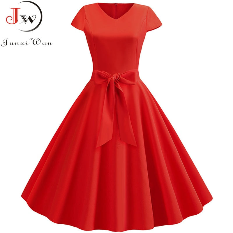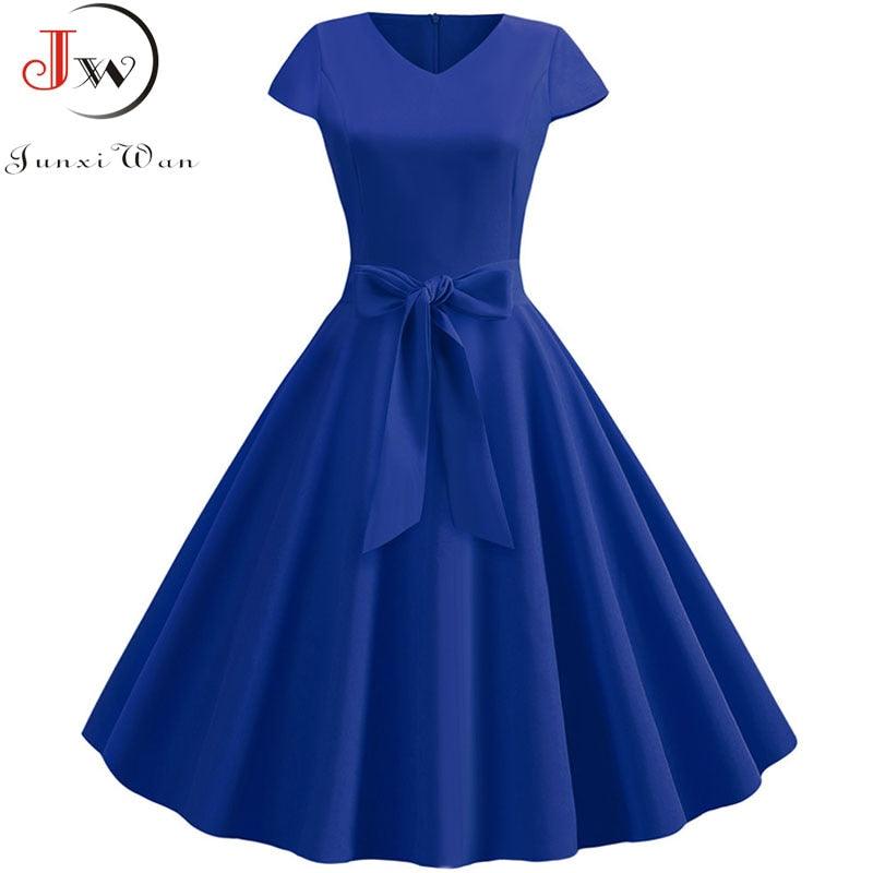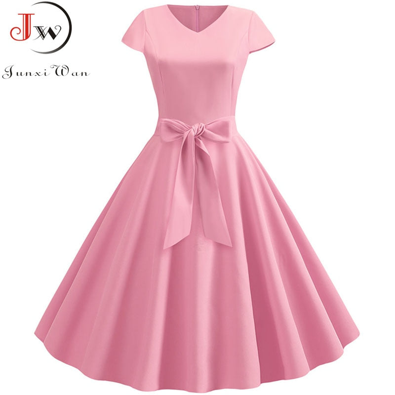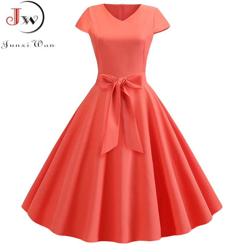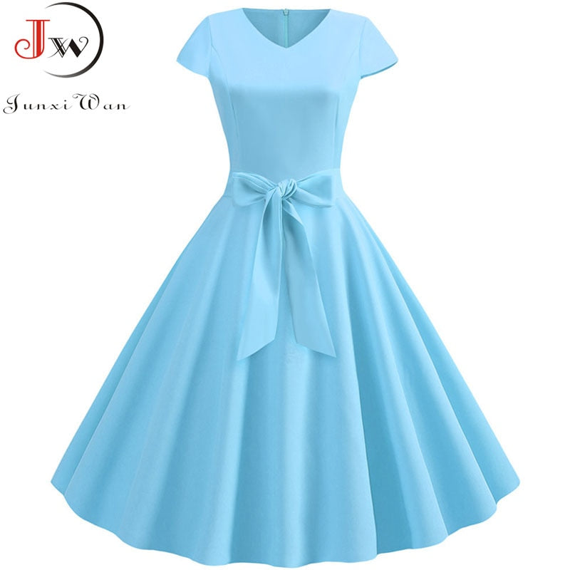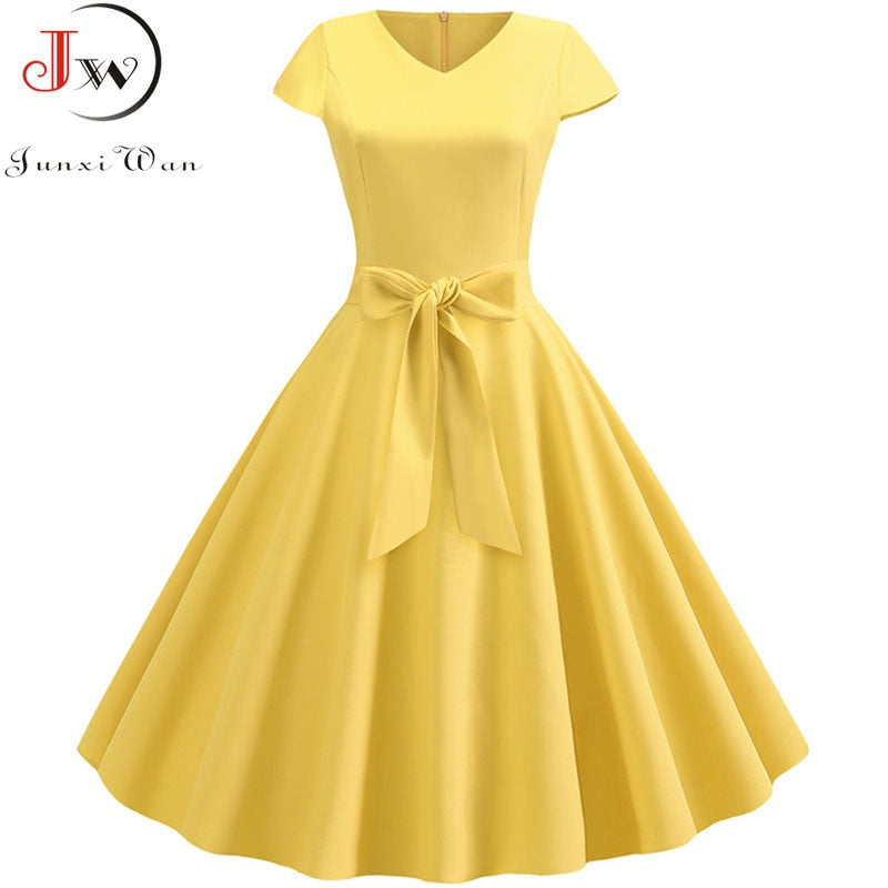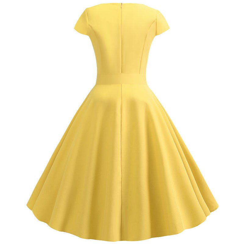 Yellow Solid Color Summer Dress Vintage Women Swing Rockabilly Dresses Robe Femme Elegant Casual Party Midi Vestidos