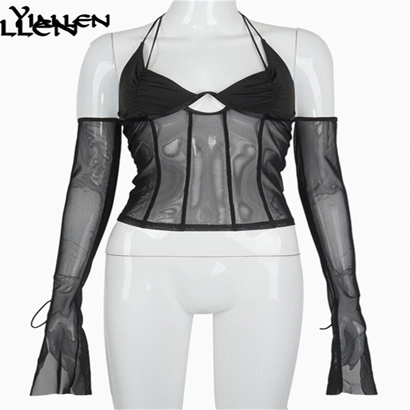 Yiallen 2021 Low Cut Mesh Top Women Halter Autumn New Club Party Black See-Through Transparent Long Sleeve Tee Shirt Female