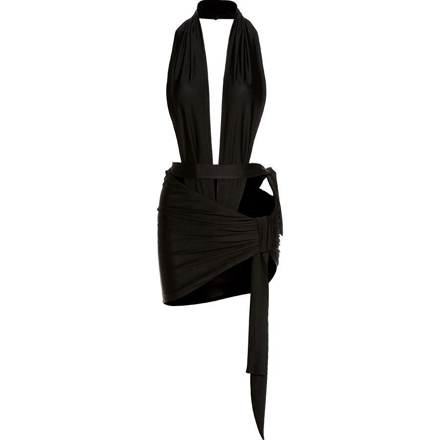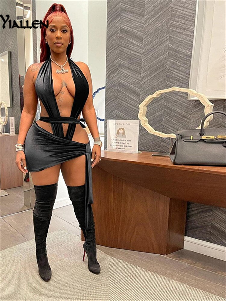 Yiallen  2021Sexy Cleavage 2 Piece Set Women Halter Sleeveless Bodysuit+Short Dress Simple Suit Solid Pleated Streetwear Female