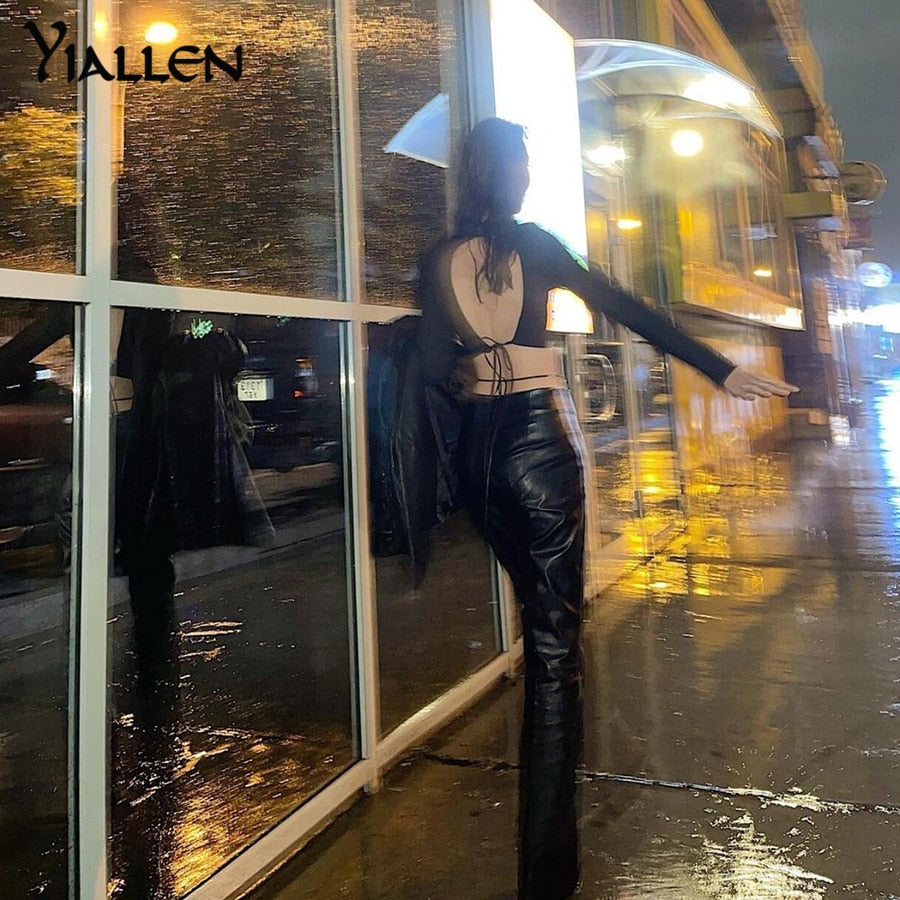 Yiallen Autumn Faux PU Leather Bandage Solid Flare Pants Women High Waist Vintage Punk All-match Trousers Streetwear Bottoms