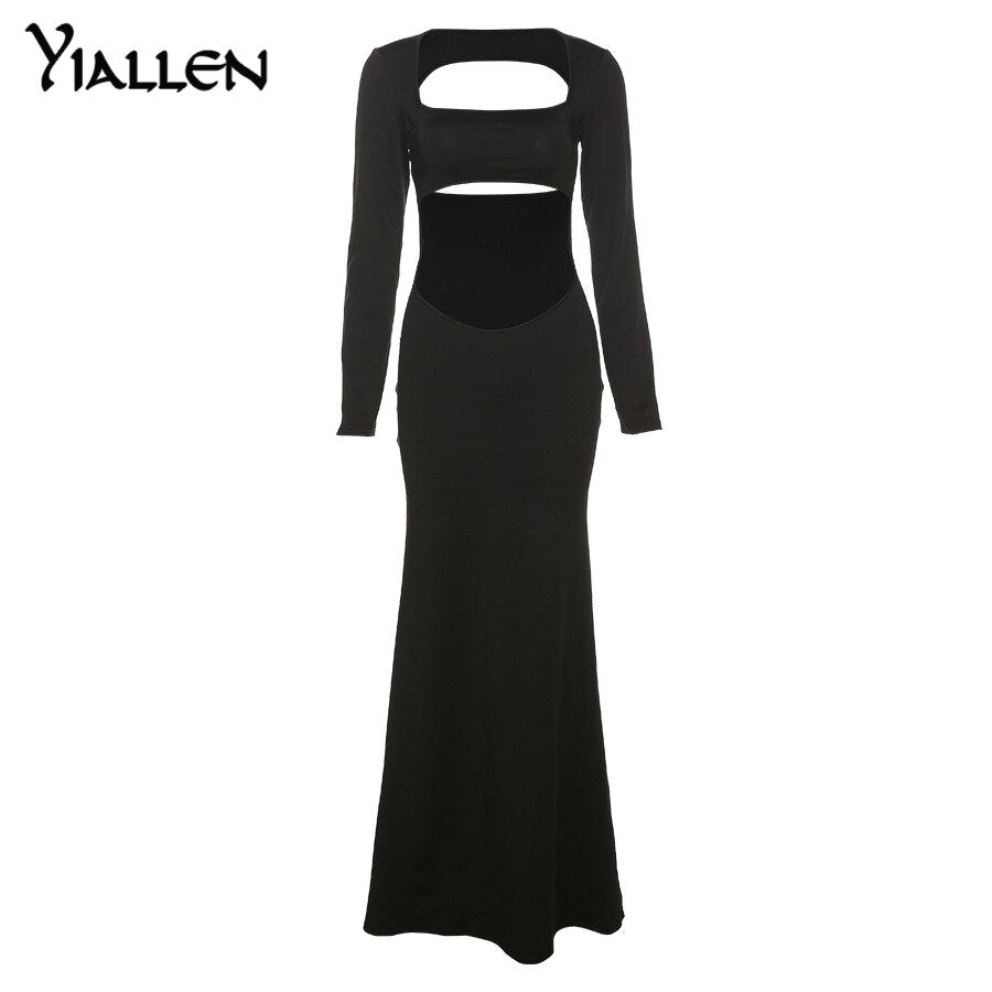 Yiallen Autumn New Fashion Sexy Hollow Out Long Sleeve Square Collar Long Dress For Women Simple Solid Club Night Dress Hot