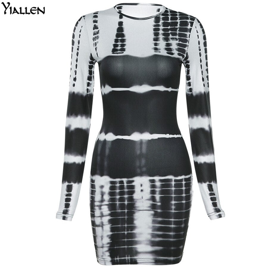 Yiallen Autumn New Printing Slim Dress Women O Neck Long Sleeve Elastic Street Casual Fashion Lady Mini Bodycon Dresses Hot