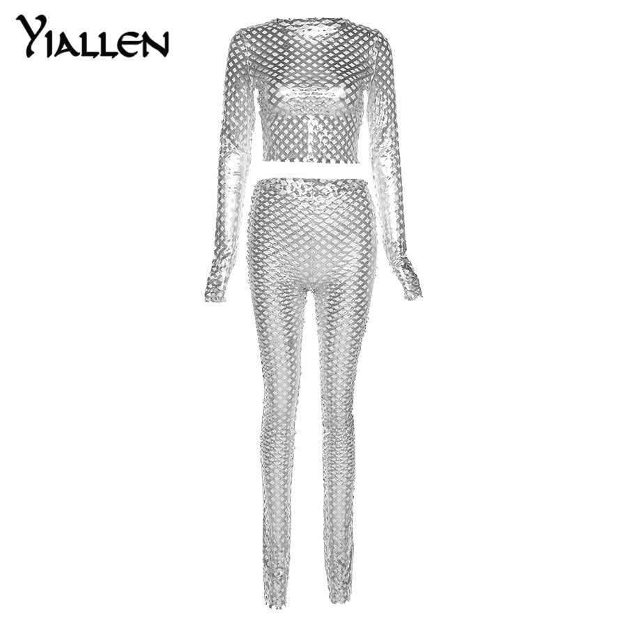Yiallen Autumn New Women Sexy Hollow Out Hole Streetwear Tracksuit Simple Slim Stretch Silver Tracksuit Two Piece Set Female