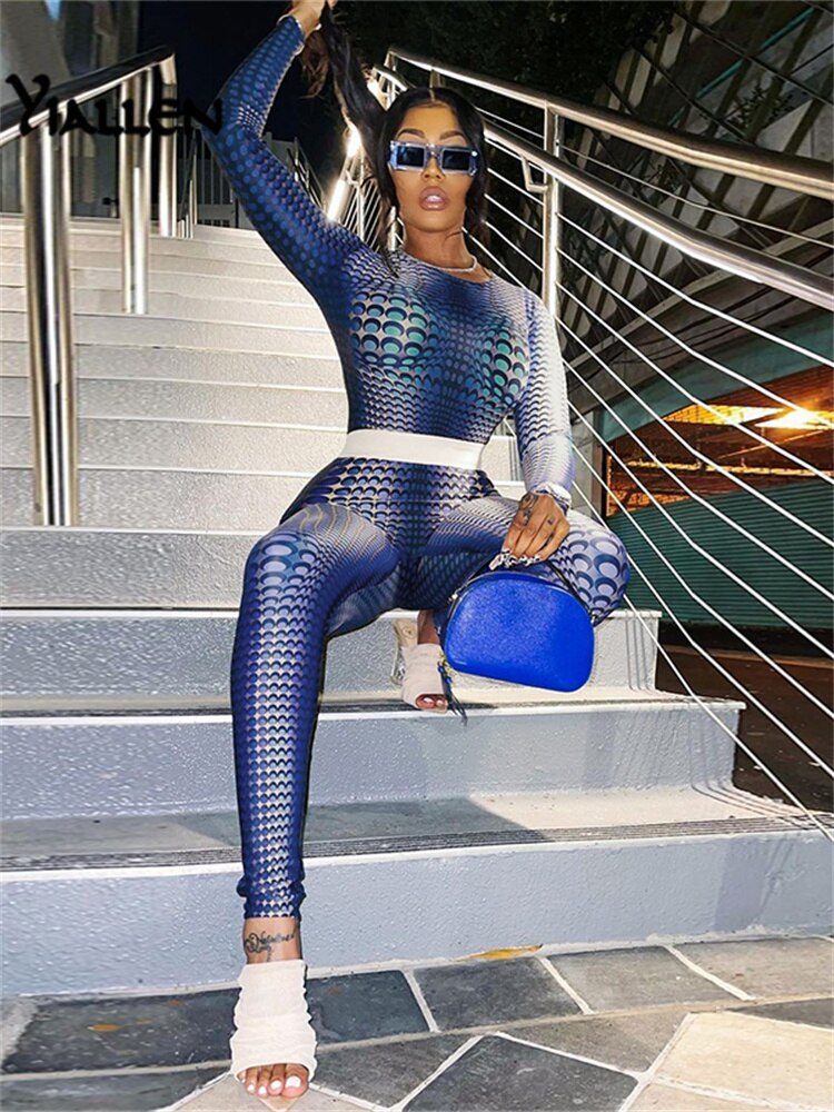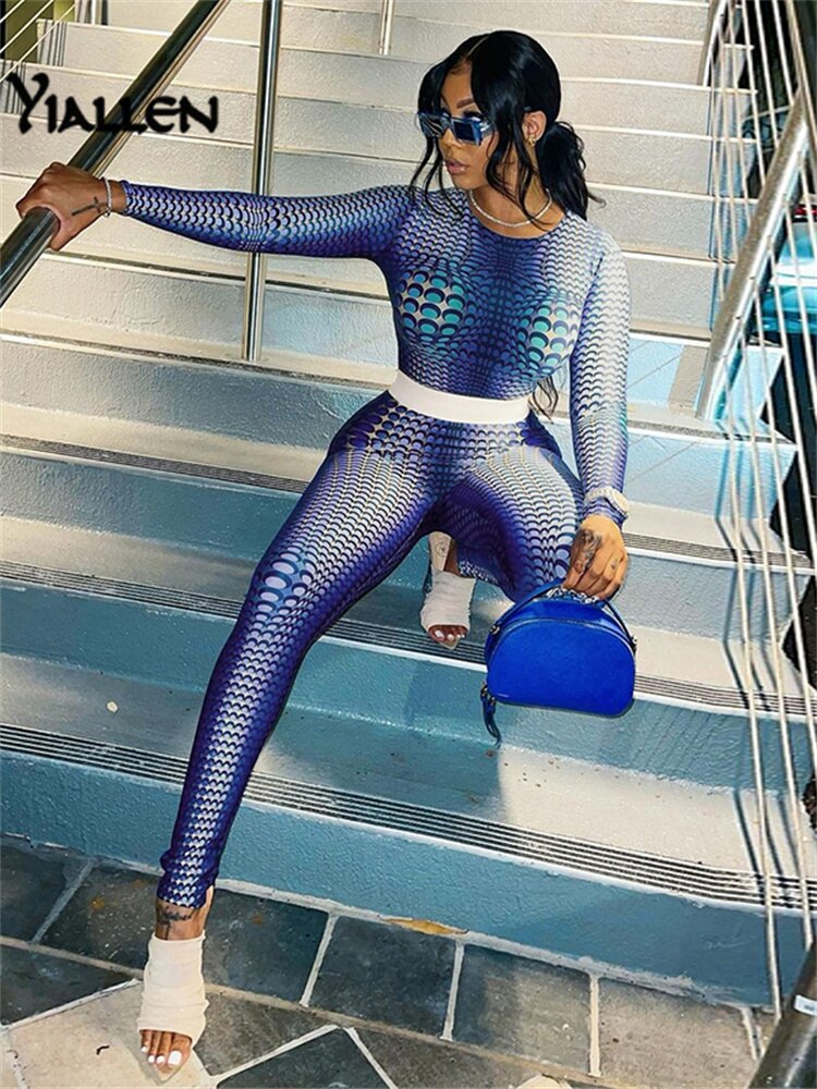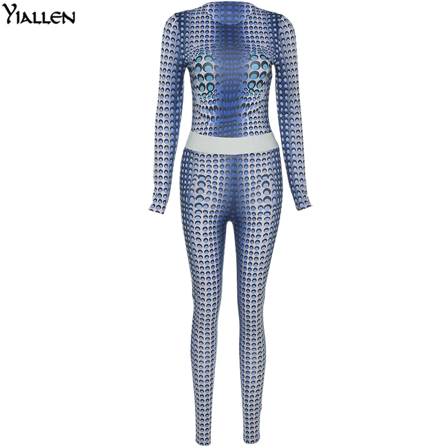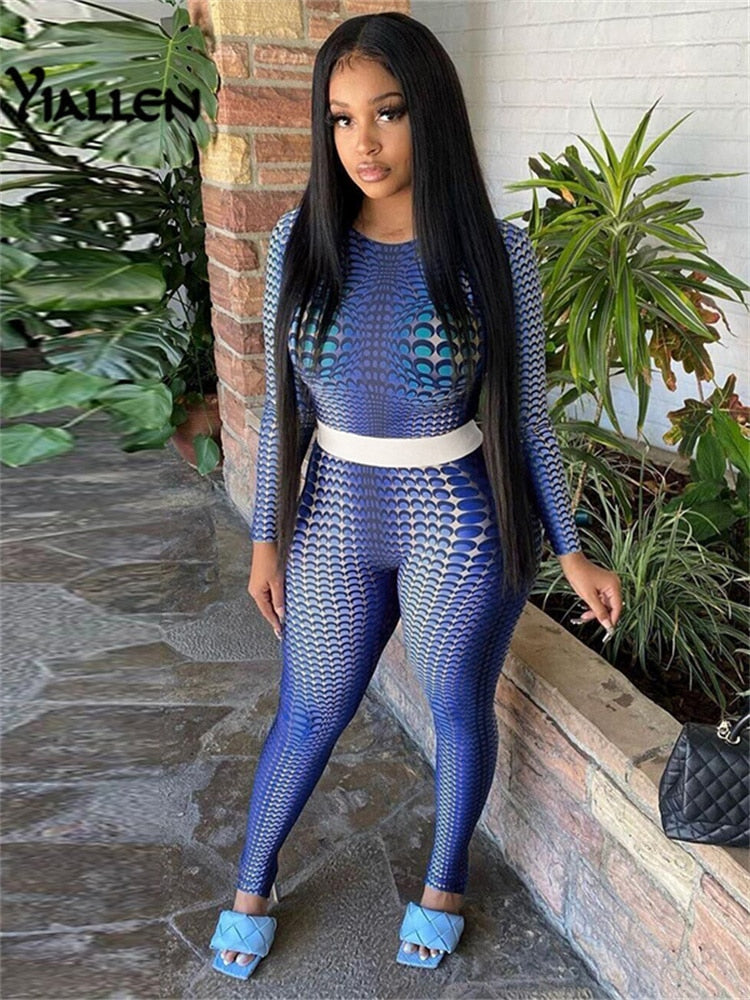 Yiallen Autumn Print 2 Piece Set Woman Long Sleeve Skinny Stretch Round Neck Top+Elastic Waist Skinny Pant High Street Wear Hot