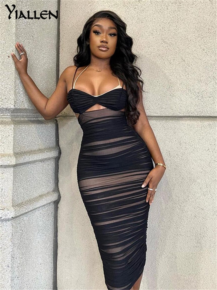 Yiallen Black Double Layer Midi Dresses For Women Summer Sexy Sleeveless Hollow Out Slim Dress Partywear Backless Club Clothing