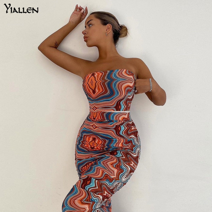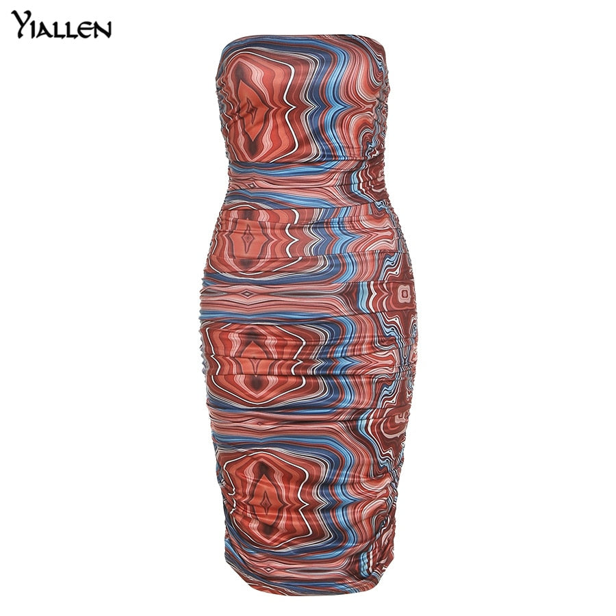 Yiallen Colorful Print Sexy Strapless Dress Women Sleeveless Skinny Stretchy Stack Trend Vacation Beach Dress Slim Outfit Hot