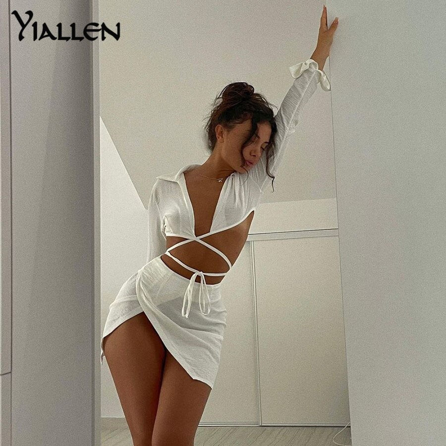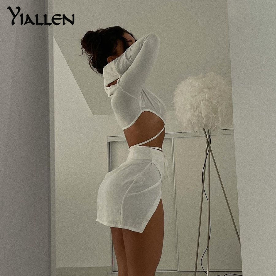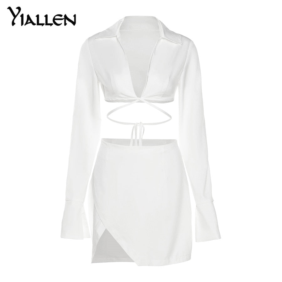 Yiallen Fashion Bandage Two Piece Set Women Skirt Criss Cross Ribbons Shirt Long Sleeve Polo-Neck Top+Loose Side Slit Outit