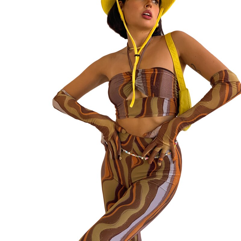 Yiallen Fashion Mesh Two Piece Set Women Lace Up Halter Slash-neck Hole Skinny Vest+Elegant Patchwork Striped Sleeve Guard Hot