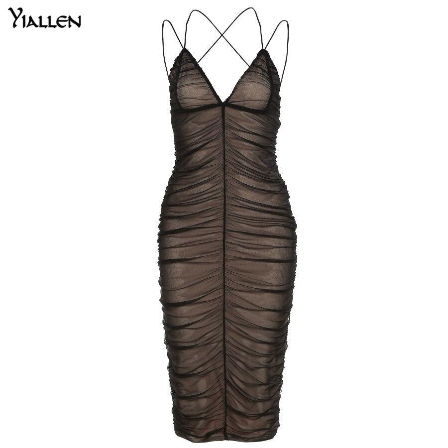 Yiallen Fashion Sexy Low Chest VNeck Backless Mesh Black Camisole Long Dress Women Summer Casual Beach Party Club Bodycon Dress