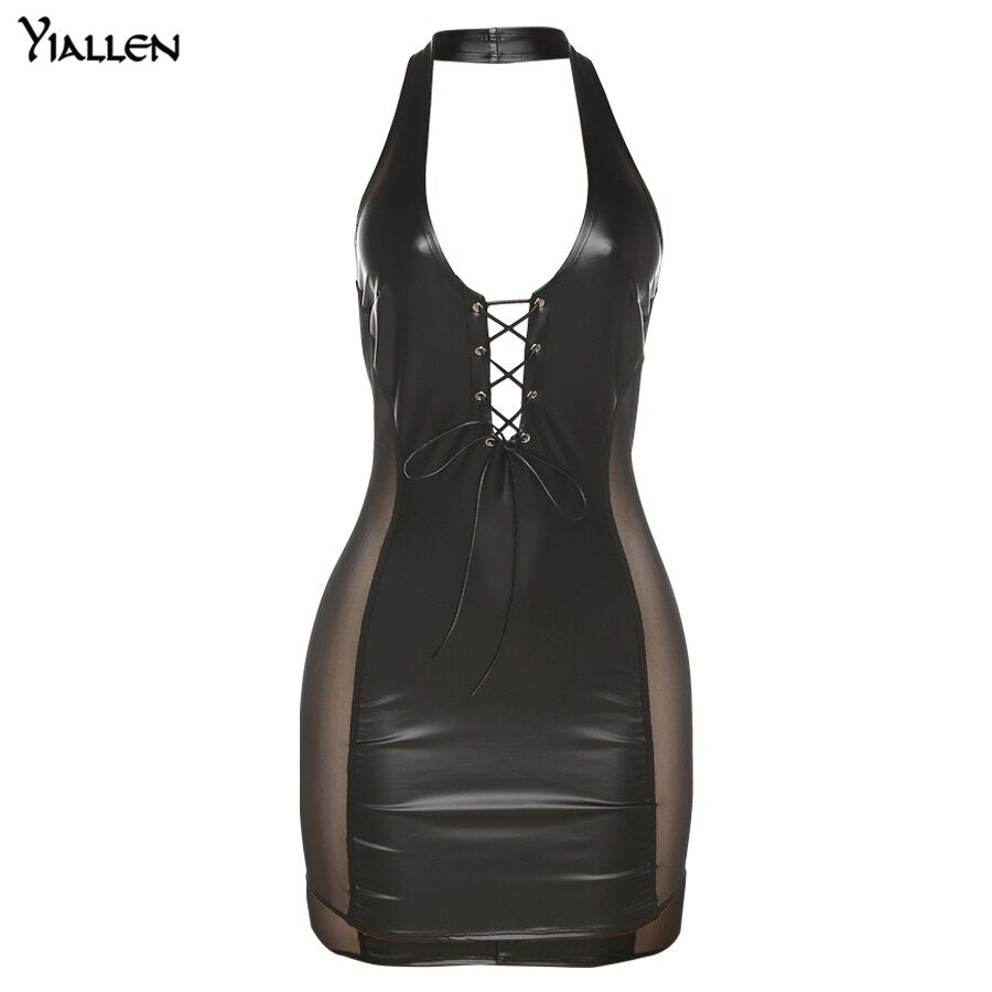 Yiallen Faux PU Leather Halter Bodycon Mini Dress Women Backless Patchwork Solid Deep V-Neck Side Lace Casual Lady Streetwear