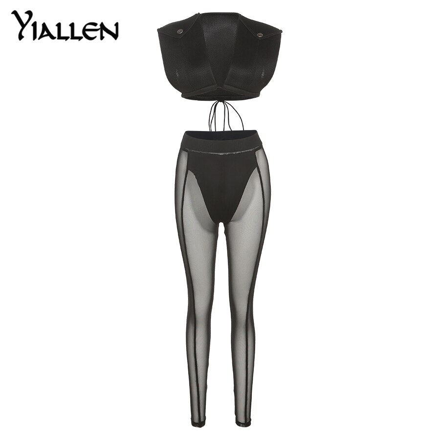 Yiallen High Street Solid Two Piece Set Women Sexy Deep V Sheath Cleavage Sleeveless Top+Mesh SeeThrough Stretchy Female Pants