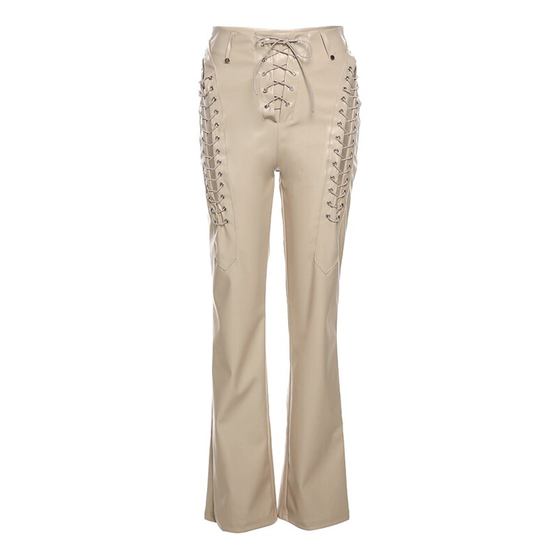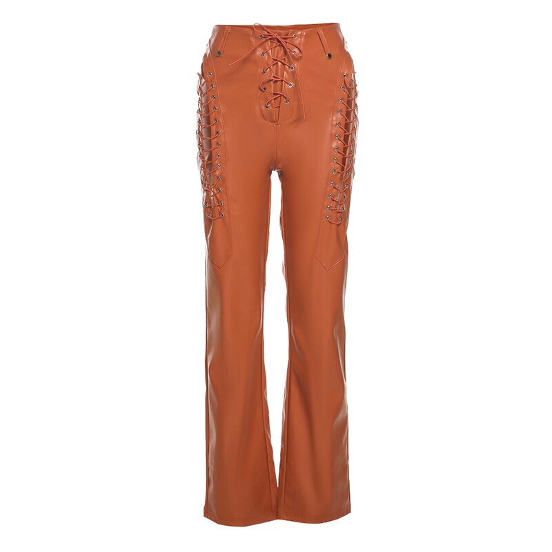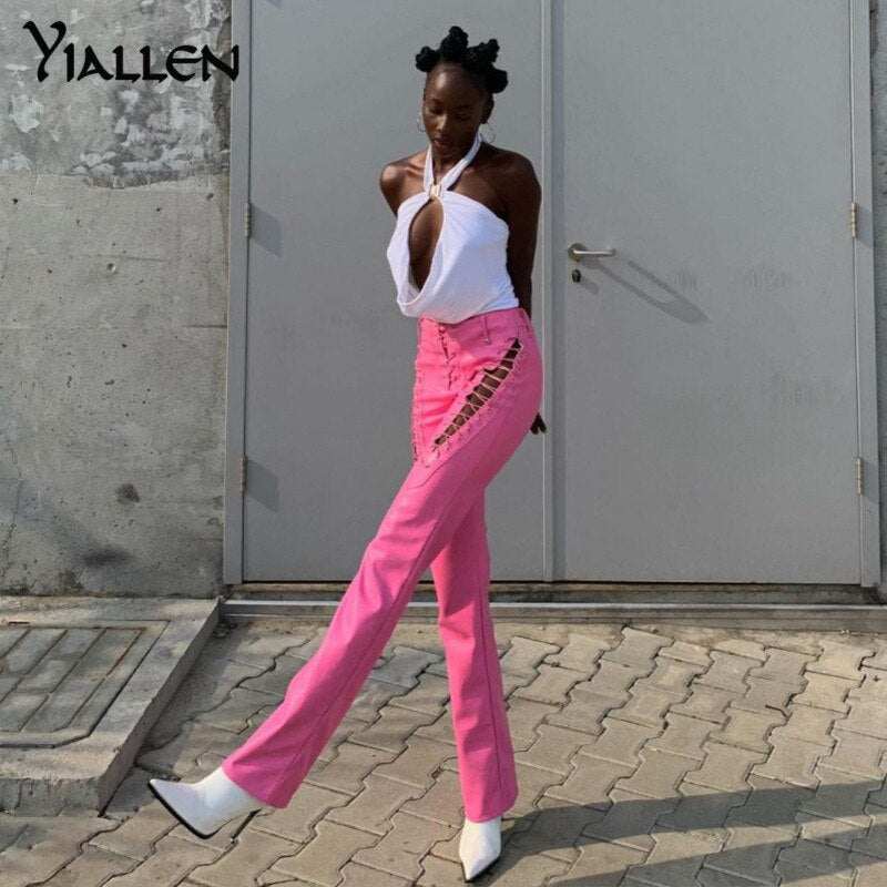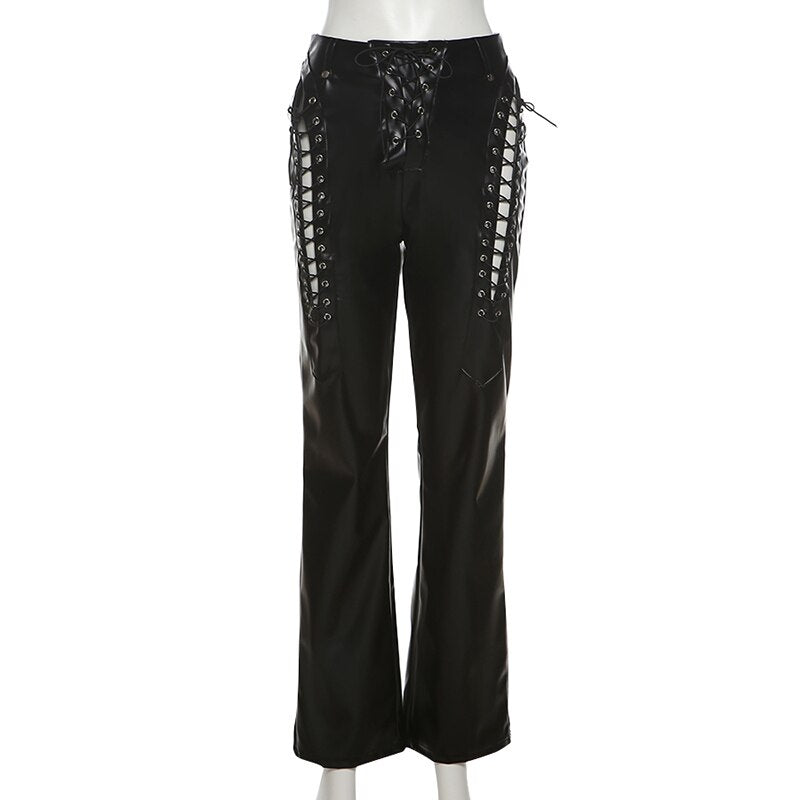 Yiallen Hollow Out Bandage Hipster Straight Trousers Women 2021 New Faux PU Leather Solid Fashion Street Style Pants Female Hot