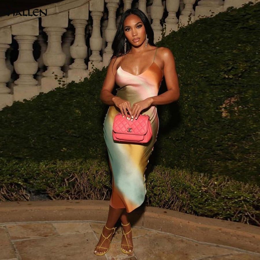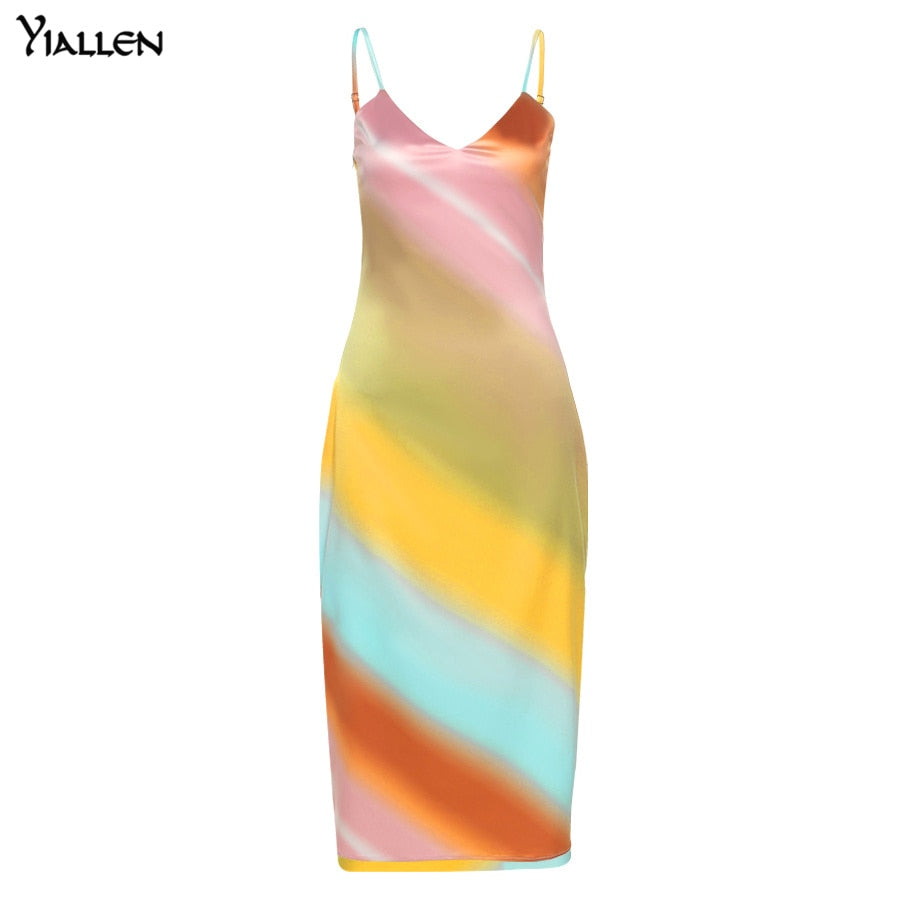 Yiallen New Multicolor Print Midi Dress Women V-Neck Spaghetti Sleeveless Slim Stretch Bodycon Streetwear Party Vacation Dress