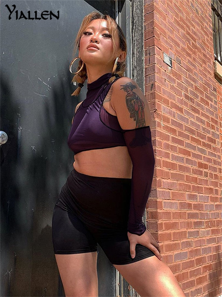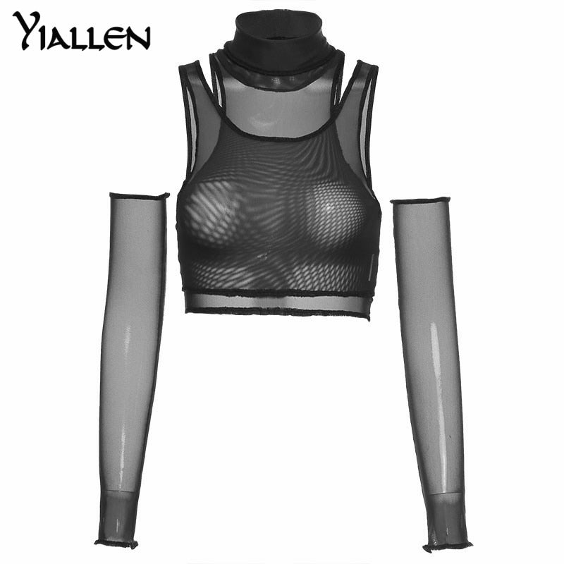 Yiallen Sexy Mesh Top See Through Knitted Straped Women Tank Tops 2 Pieces Streetwear With Gloves Turtleneck Clubwear Punk 2021