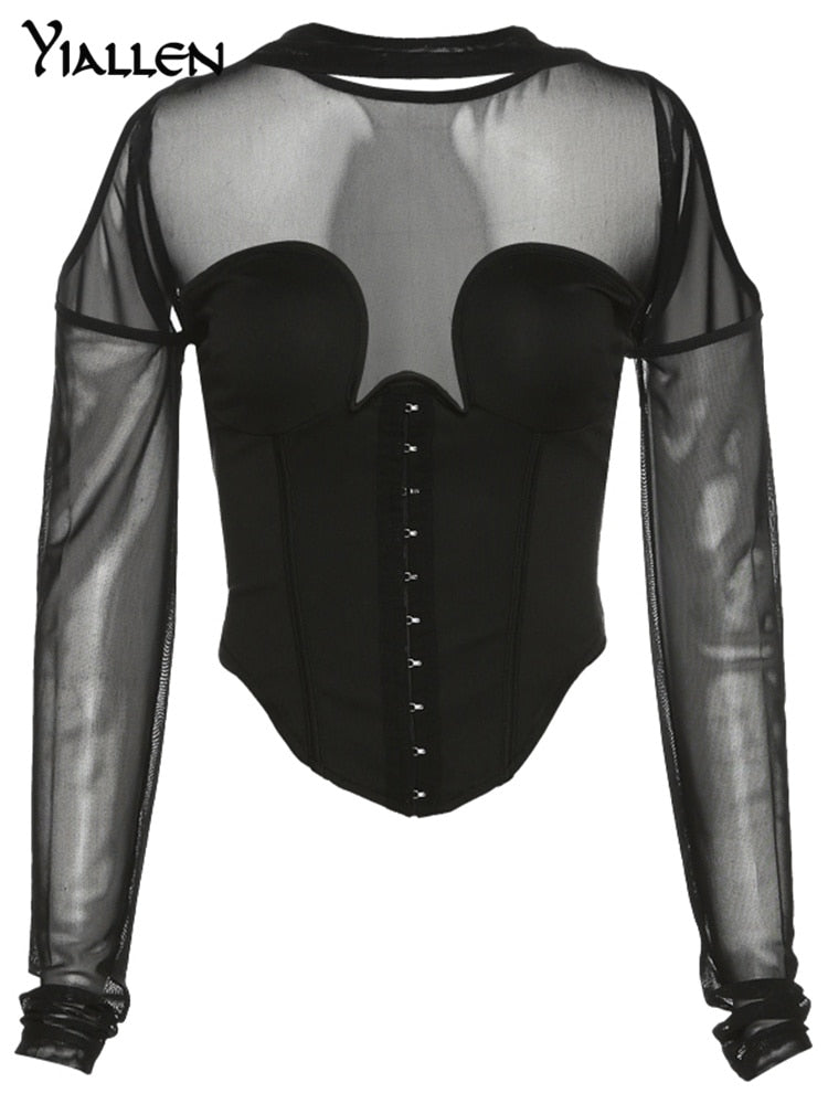 Yiallen Solid Y2K Hollow T-Shirt Women Off Shoulder Corset Design Mesh Patchwork Casual Tops Elastic Slim Hot Street Outfit Hot