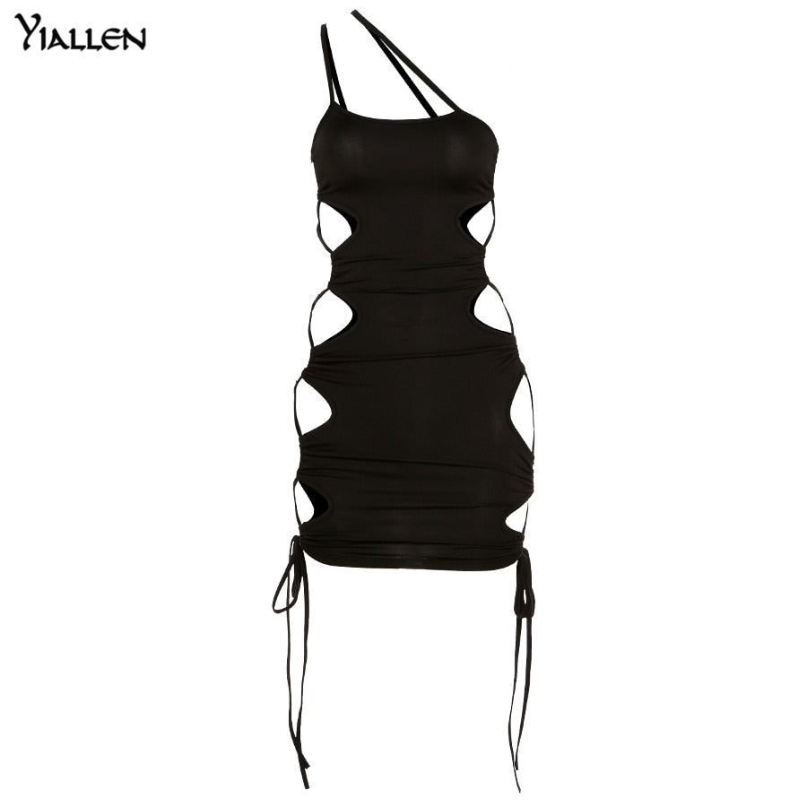 Yiallen Summer Black Sexy Hollow Out Lace Up Sling Slim Dress Women Fashion Sleeveless Clothing Lady Solid Mini Dresses