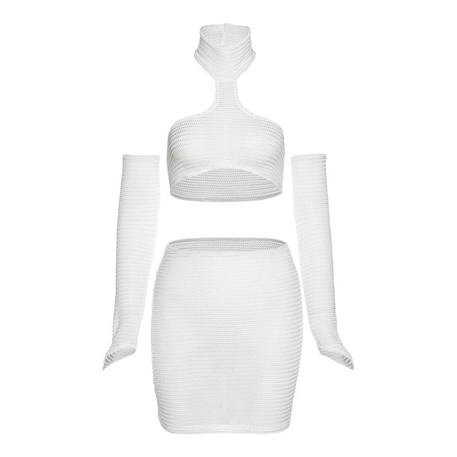 Yiallen Summer Sexy 3Piece Set Womens Outfit Halter Crop Tops+Mini Hip Skirt With Sleeve Girl Mathching Elegant Special Clothing