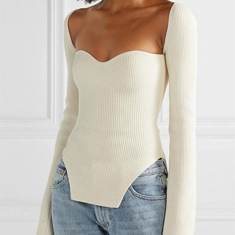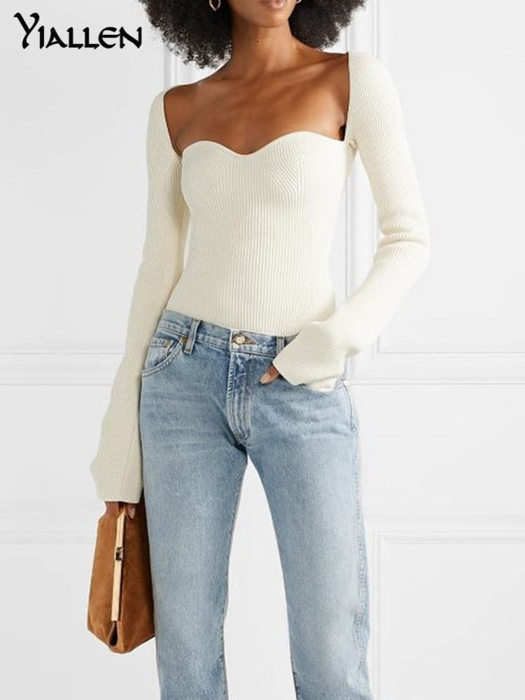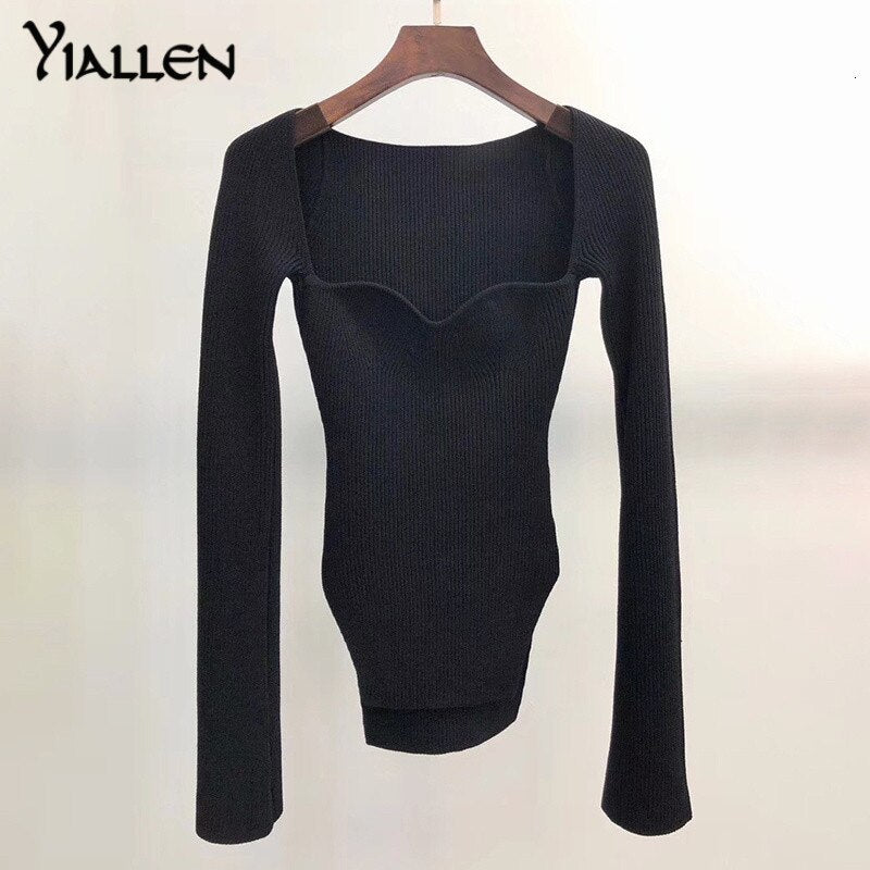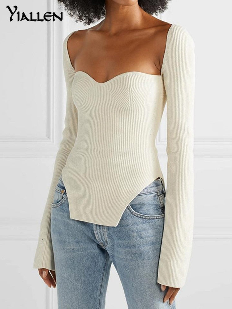 Yiallen White Side Split Knitted Women's 2022 Sweater Square Collar Long Sleeve Sweaters Female Autumn Fashion New Clothes Hot