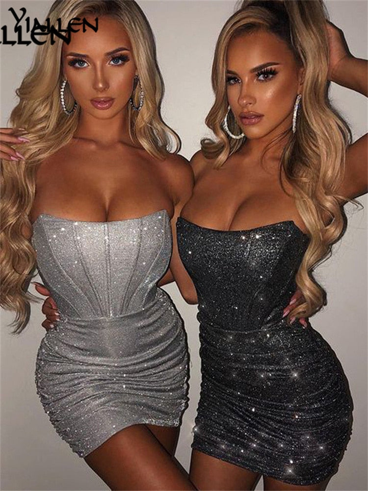 Yiallen Women Sequins Mini Party Dresses Summer Strapless Fashion Solid Sleeveless With Fishbone Mini Skinny Dress High Quality